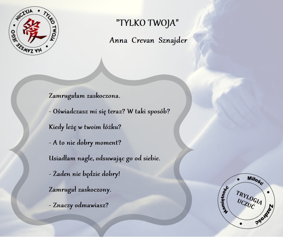 “W ciszy i ciemności nocy słychać tylko nasze oddechy. Na początku spokojne, miarowe, równe. Nie pada żadne słowo. Nic nie mówimy – bo po co? Oboje jesteśmy świadomi, że to już ostatni raz. Ostatnia taka noc. Wpatrzeni w siebie, spragnieni bliskość, wciąż jeszcze trwamy jakby w zawieszeniu. Jakbyśmy się bali, że początek będzie jednocześnie końcem wszystkiego. Tak właśnie jest i tak będzie. Powoli, nieśmiało wyciągasz do mnie dłonie.”